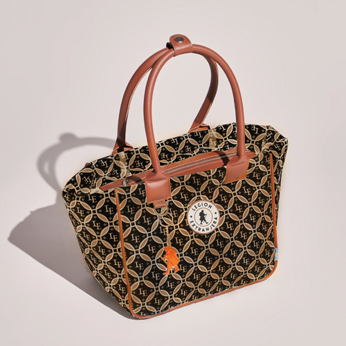 Tote de tamaño mediano, con cierre principal y bolsillo interno con cierre. Las manijas son de simil cuero a tono con la tela base. El eje de la manija es ideal para usar colgada en el hombro o a mitad del brazo. En el centro delantero tiene ubicado nuestro logo de goma en blanco con detalles en marron.